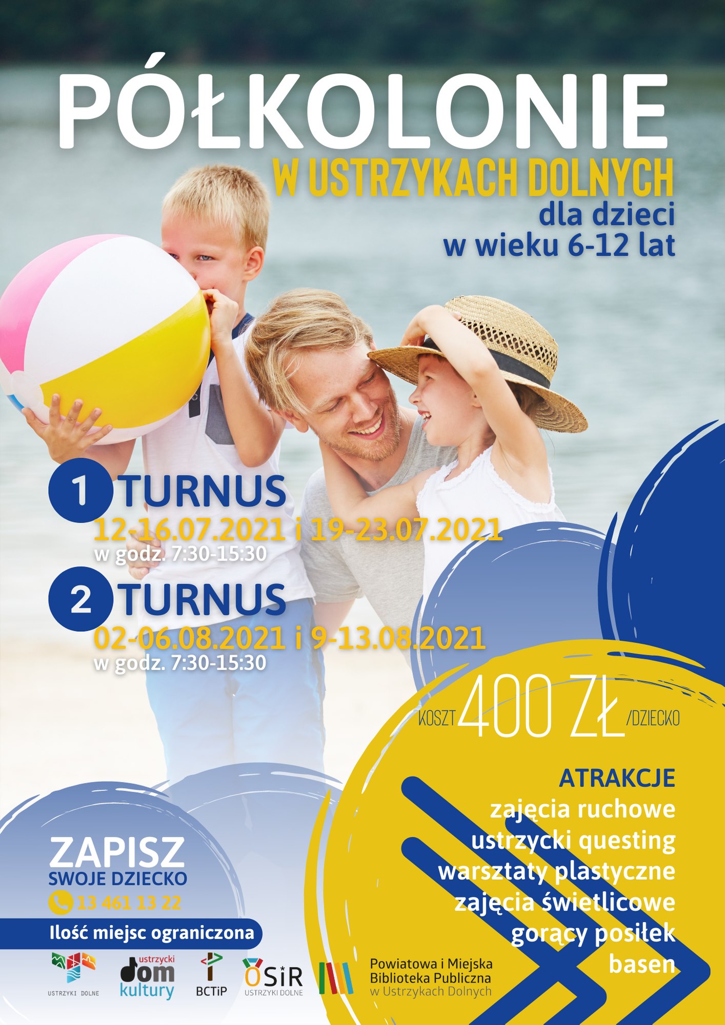 w godz. 7:30 - 15:30. Koszt jednego turnusu to 400 zł. Zapisy odbywają się telefonicznie pod nr tel. 13 461 13 22. Ilość miejsc ograniczona. Baw się z nami w te wakacje.