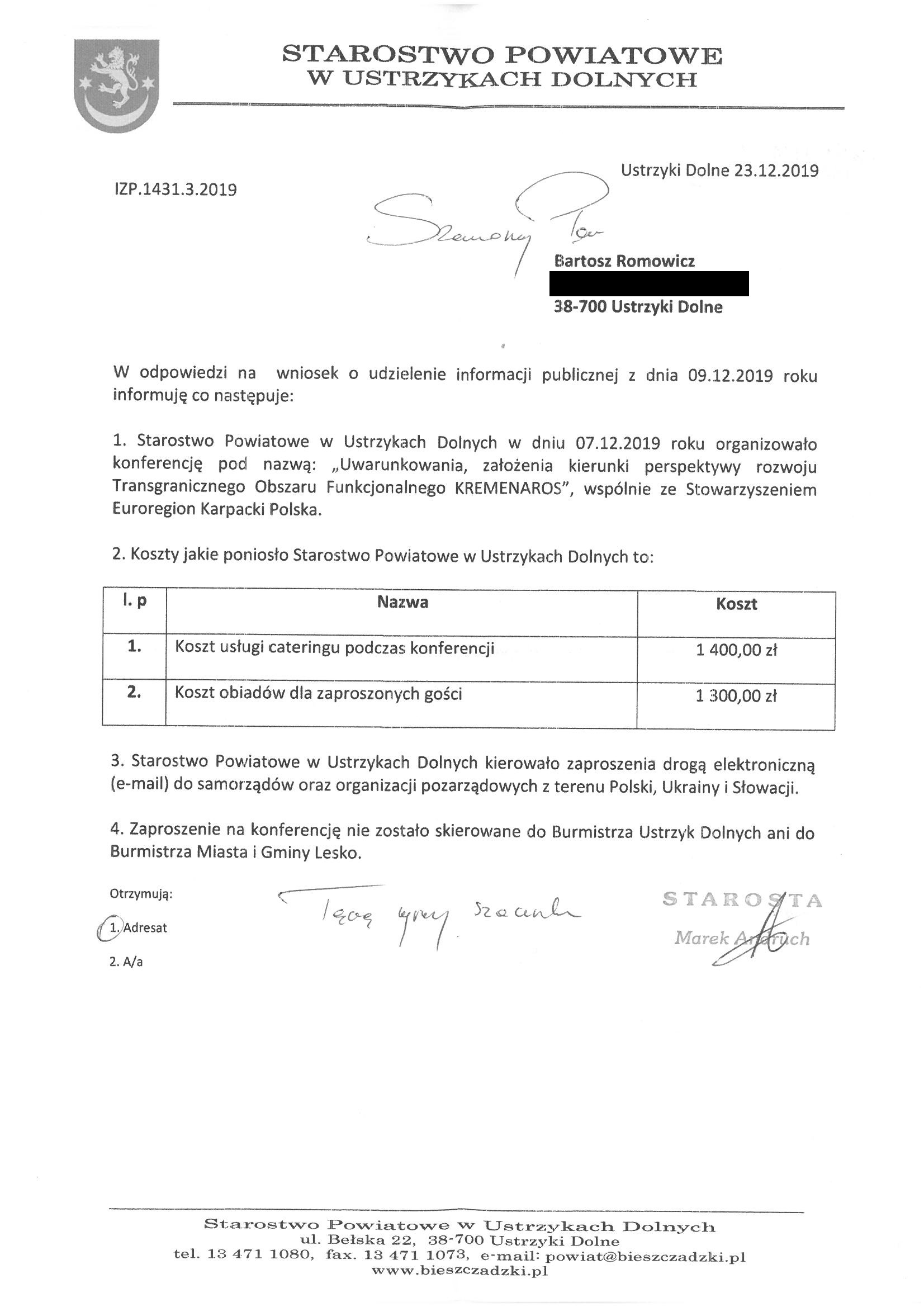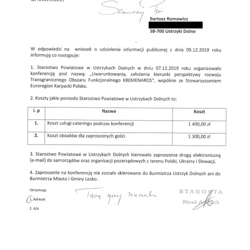 Uprzejmie wyjaśniam, że zarówno ja, jak i Burmistrz Miasta i Gminy Lesko Adam Snarski nie wzięliśmy udziału w konferencji, ponieważ nie posiadaliśmy o niej wiedzy, a ponadto nie byliśmy zaproszeni do udziału w niej. Początkowo przypuszczałem, że być może to niedopatrzenie ze strony organizatorów lub przyczyny techniczne (zaproszenia były przesyłane przez e-mail), dlatego zwróciłem się do Starosty Bieszczadzkiego z wnioskiem o udzielenie informacji publicznej. W odpowiedzi Starosta Bieszczadzki stwierdził, że "Zaproszenie na konferencję nie zostało skierowane do Burmistrza Ustrzyk Dolnych ani do Burmistrza Miasta i Gminy Lesko".