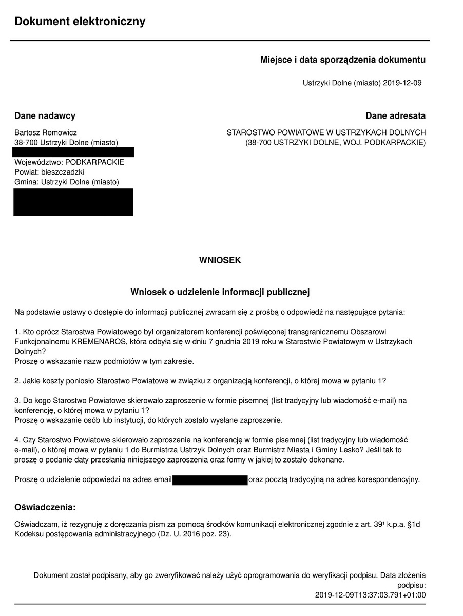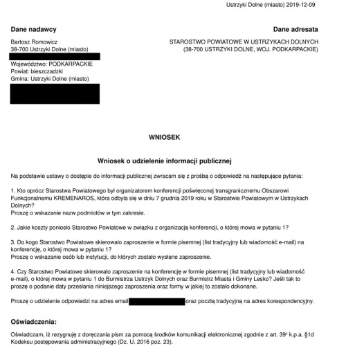 Ocenę sytuacji pozostawiam Państwu. Poniżej zamieszczam wniosek o udzielenie informacji publicznej oraz odpowiedź Starosty Bieszczadzkiego. Zdjęcie pochodzi z profilu Stowarzyszenia Euroregion Karpacki Polska.
